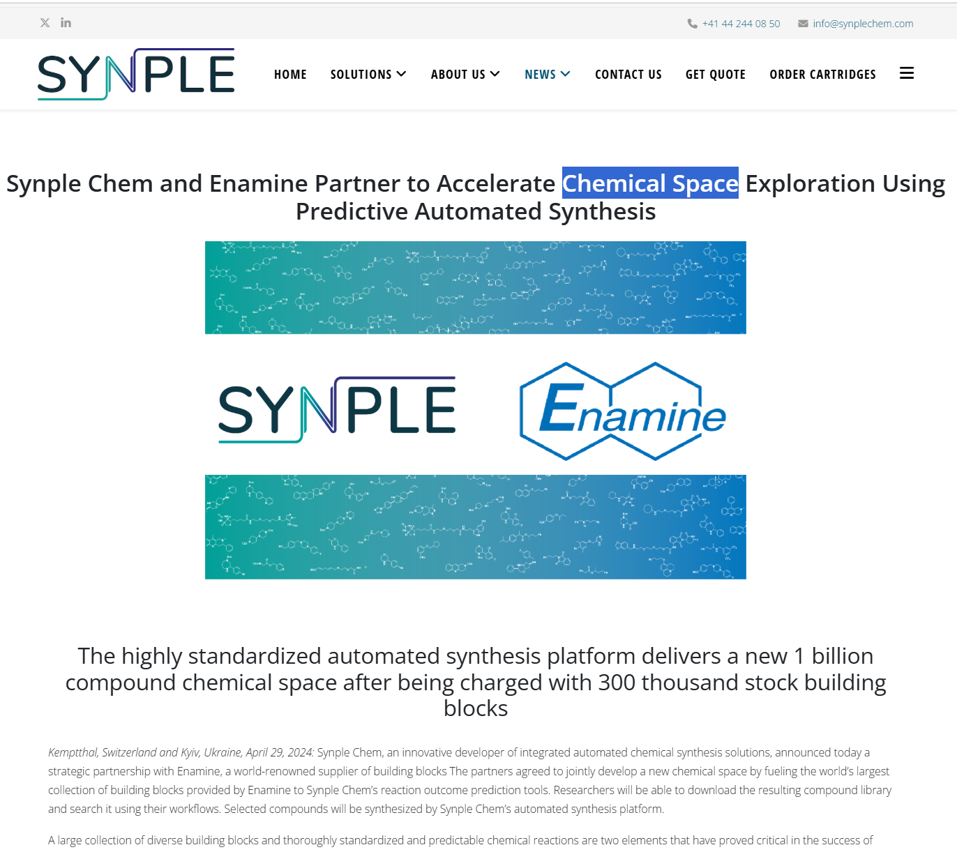 Enamine与瑞士ETH Zurich孵化的自动化合成先锋Synple Chem正式宣布战略合作——双方将共同构建一个包含约10亿种全新化合物的可合成虚拟化学空间,并实现从虚拟筛选到自动化合成的一键打通。
