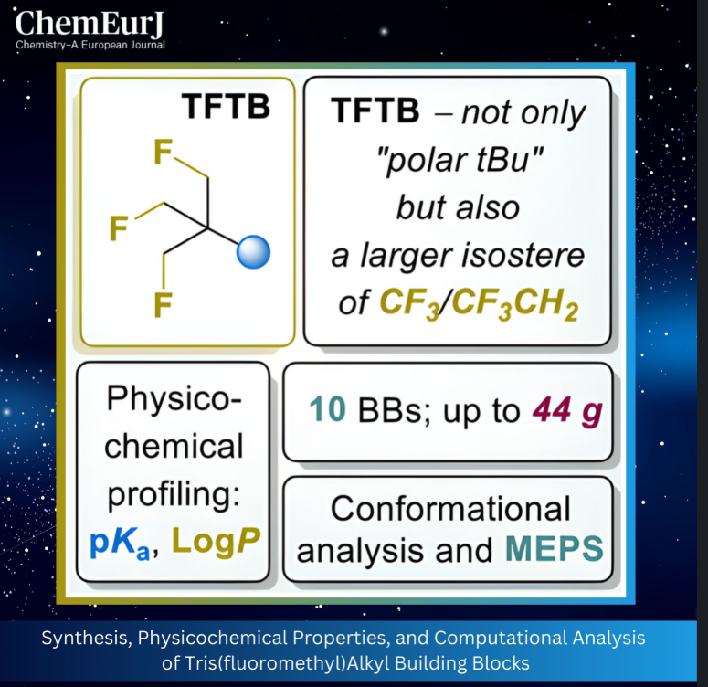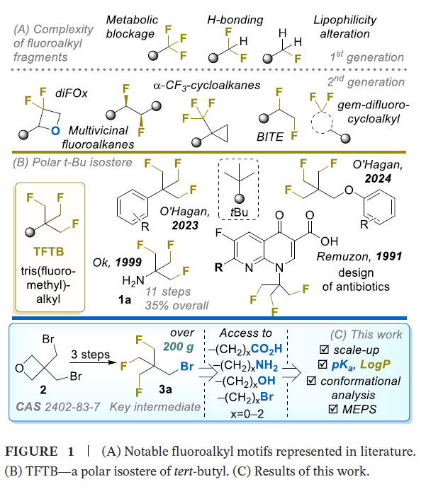 本文报道了以商用3,3-双(溴甲基)氧杂环丁烷为起始原料,简洁、可规模化合成三(氟甲基)烷基砌块(包括胺、羧酸、醇和溴化物)的方法。通过测定相应胺类和羧酸类化合物的解离常数(pKd)与脂水分配系数(Log P),并与低氟取代及无氟取代的同类物进行对比分析,完成了全面的理化特征表征。结果表明,三(氟甲基)甲基(β,β',β''-三氟叔丁基,(FCH2)3C,简称 (TFTB)基团虽空间位阻体积显著更大,但其电子效应和极性调节特性与三氟甲基(CF3)、2,2,2-三氟乙基(CF3CH2)取代基相似。构象分析显示,(FCH2)3C基团受空间静电相互作用调控,仅存在少量低能稳定构象,其中C=O⋅⋅⋅H−C和C−F⋅⋅⋅H−C相互作用对构象稳定起到关键作用。分子静电势分析阐明了该基团反常的脂溶性变化规律,以及其类三氟甲基的极性调节特征。上述研究数据均证实,TFTB基团是药物设计中极具价值的等排取代基序。