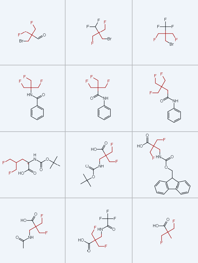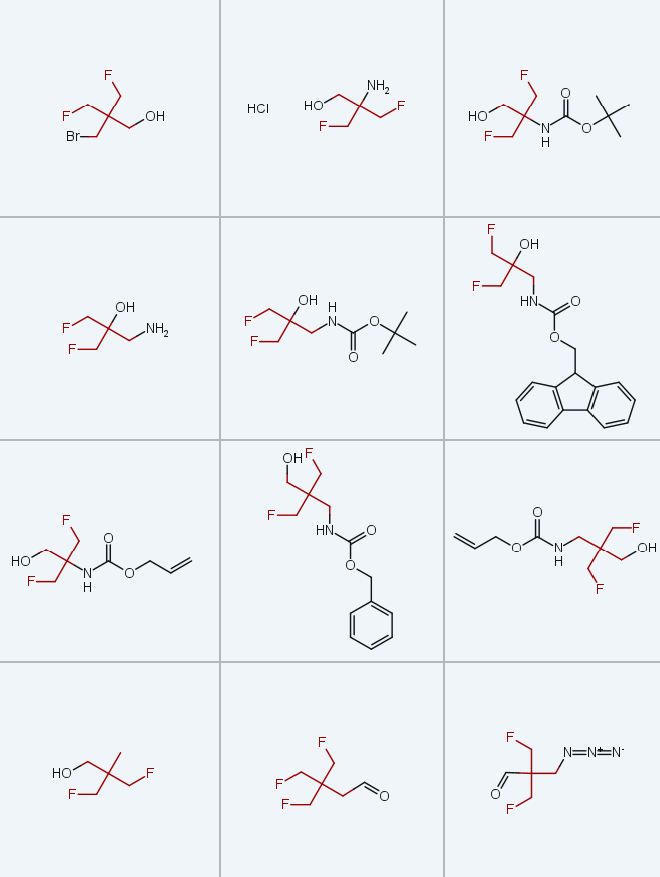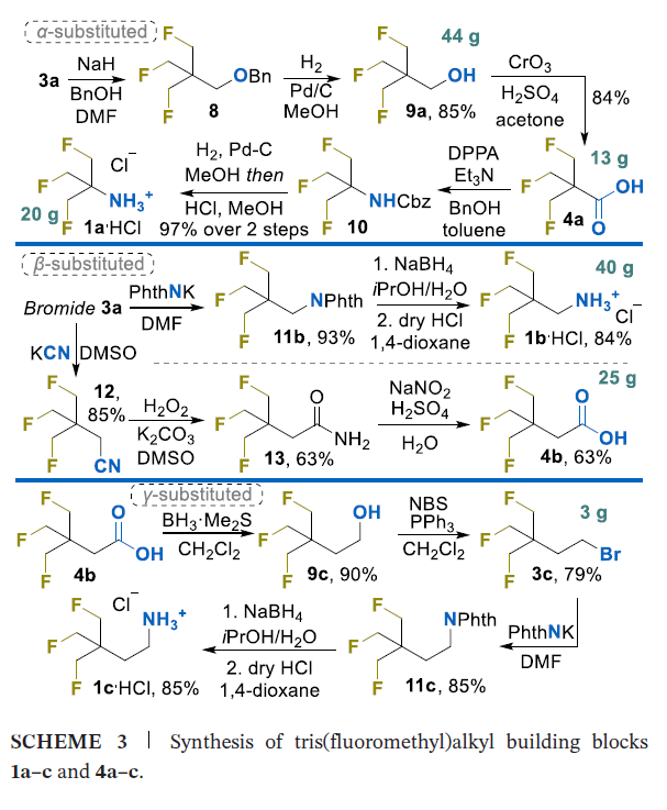 本研究以商用氧杂环丁烷衍生物为起始原料,建立了三氟甲基烷基(即β,β',β''-三氟叔丁基,TFTB)取代砌块的简洁、可规模化合成路线,制备得到含氨基(NH2)、羧基(COOH)、羟甲基(CH2OH)、溴甲基(CH2Br)等官能团的衍生物。本研究的关键中间体(FCH2)3CCH2Br经三步反应合成,总产率40%,且可放大至200g规模,产率无显著下降。