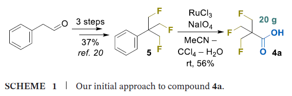 本研究最初计划通过氧化苯衍生物5制备羧酸4a(方案1)[20],其中化合物5可按O’Hagan课题组报道的方法,以苯乙醛为起始原料经三步反应合成,总产率37%[20]。
