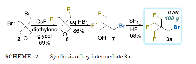 该方法虽能成功制备目标产物,但氧化步骤在放大生产时存在明显问题,因此本研究改用替代合成策略。新策略以氧杂环丁烷开环反应为基础,制备溴化物3a(方案2):将化合物2与氟化铯(CsF)在高温下反应,得到偕二氟甲基氧杂环丁烷6,分离产率69%;通过酸促进的氧杂环丁烷环开环反应,得到γ-溴代醇7,产率86%[24];最后采用四氟化硫/氟化氢(SF4/HF)混合体系对新戊醇5进行脱羟基氟化,得到目标产物 TFTB-CH₂Br(3a),分离产率68%。该合成路线可实现放大生产,单次反应可制备200g以上的化合物3a,且产率无显著下降。