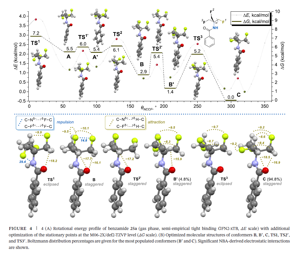 NPA分析解释了旋转能量曲线中交错过渡态TS1′和TS2的存在:这些物种虽无上述偶极-偶极去稳定相互作用,但破坏了所有低能构象中均存在的C=Oδ−⋅⋅⋅H−Cδ+稳定相互作用,导致自由能升高;该现象也是构象B和B′能量相对较高的原因之一,其中构象B′的C=Oδ−⋅⋅⋅H−Cδ+相互作用抵消了C−Fδ−⋅⋅⋅C−Fδ−偶极-偶极排斥作用的影响。上述结果表明,酰胺片段中的杂原子(氧、氮)对TFTB优势构象的稳定起到关键作用,这也使α-杂原子取代TFTB衍生物成为药物研发中极具特色的分子片段。