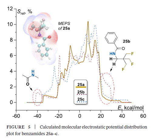 该结果在一定程度上与实验测得的Log P变化规律相符:25a和25c的分子静电势分布相似,而25c含有两个额外的亚甲基,理论上应具有更高的脂溶性。进一步分析发现,25b的高电势区对应亚甲基上高度极化的C-H键,该效应在25a中完全不存在,在25c中也显著减弱。上述发现为25a脂溶性较高的现象提供了合理的解释:一方面,25a中不存在同时受酰胺和TFTB基团直接/间接极化的C-H键(如 25b中的此类键);另一方面,氟原子的强诱导效应降低了羰基的极化程度(低电势区的静电势分布可佐证),最终导致分子整体极性降低。此外,羰基氧原子的氢键形成能力[41]也因上述极化重排而下降,这也是其脂溶性升高的另一原因。